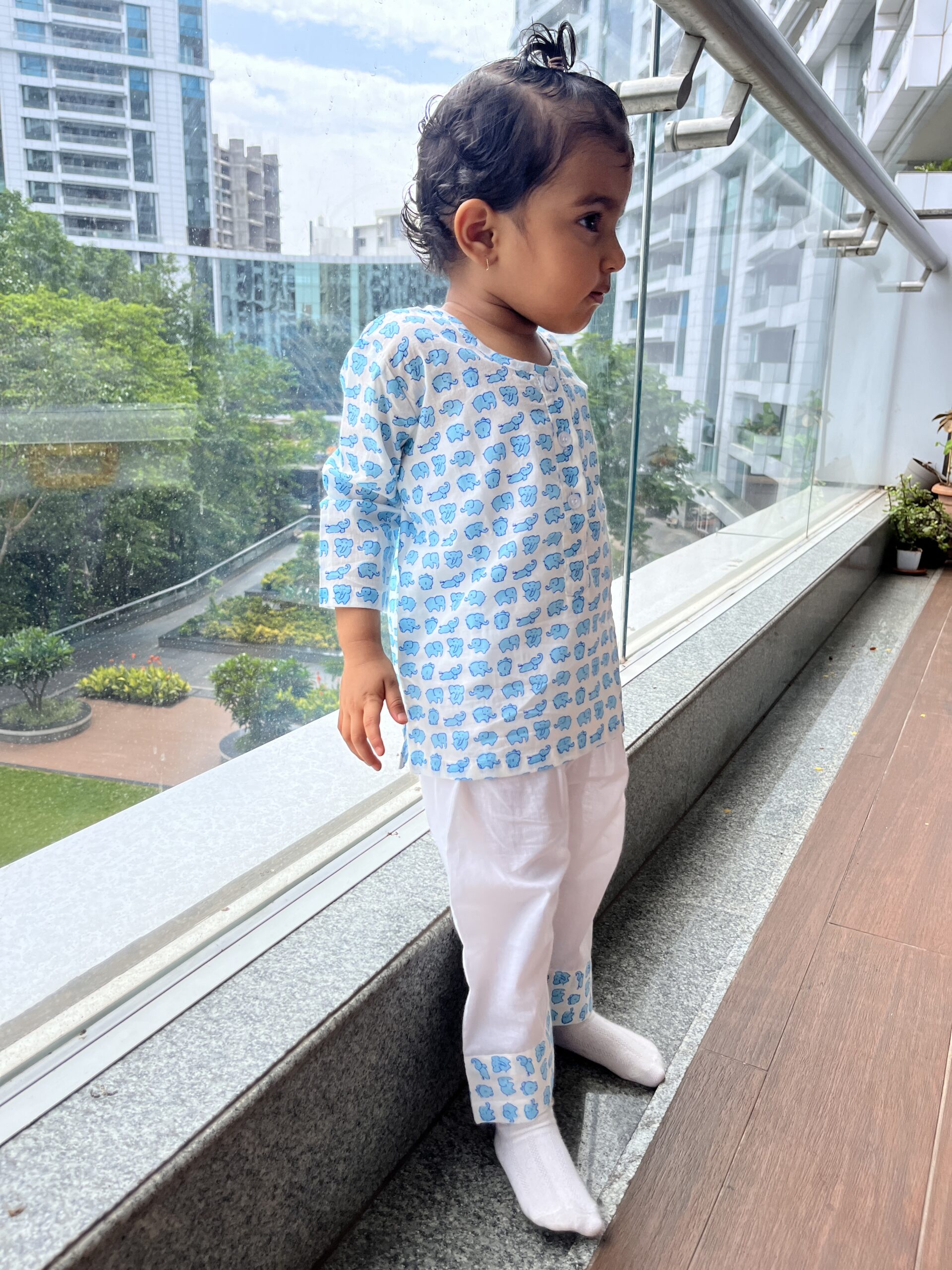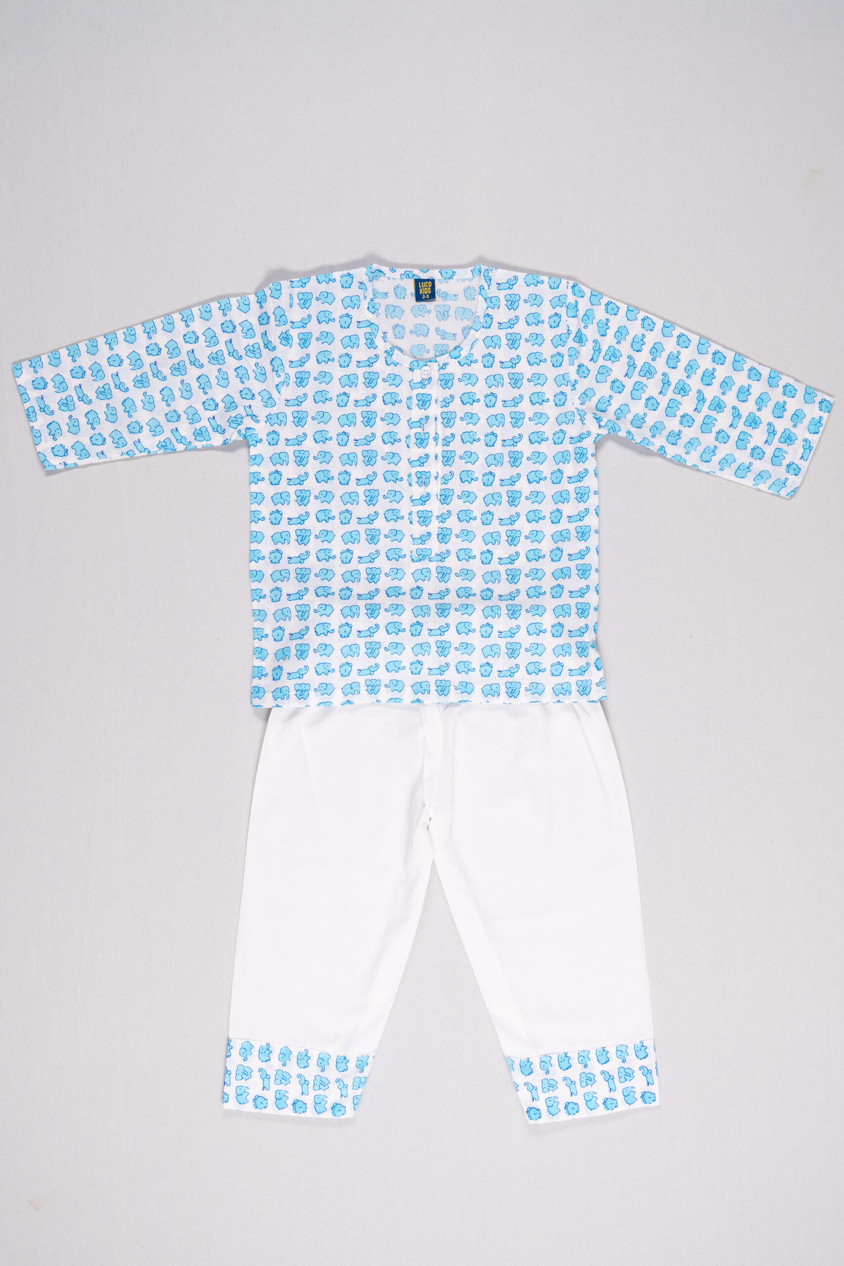 Enter the playful realm of our Mini Elephant nightsuit set with adorable miniature elephants in the most beautiful sky blue. Crafted meticulously from luxurious cotton with unmatched softness and breathability. Spark their creativity with this super cute pajama set that will make bedtime such a delight!